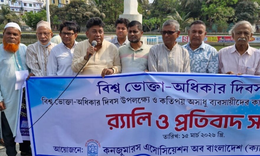 কনজুমারস এসোসিয়েশন অব বাংলাদেশ ক্যাব চাঁদপুর জেলা শাখার আয়োজনে বিশ্ব ভোক্তা অধিকার দিবস উপলক্ষে ও কতিপয় অসাধু ব্যবসায়ীদের কারসাজিতে দ্রব্যমূল্য বৃদ্ধির প্রতিবাদে মানববন্ধন, রেলি ও প্রতিবাদ সভা অনুষ্ঠিত হয়েছে।