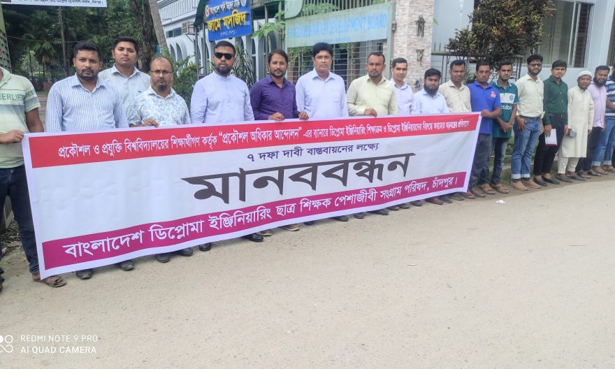 প্রকৌশল ও প্রযুক্তি বিশ্ববিদ্যালয়ের শিক্ষার্থী কর্তৃক প্রকৌশল অধিকার আন্দোলনের ব্যানারে ডিপ্লোমা ইঞ্জিনিয়ারিং শিক্ষাক্রম ও ডিপ্লোমা ইঞ্জিনিয়ারদের বিরুদ্ধে অব্যাহত ষড়যন্ত্রের প্রতিবাদে ৭দফা দাবি বাস্তবায়নের লক্ষ্যে চাঁদপুরে মানববন্ধন অনুষ্ঠিত হয়েছে।