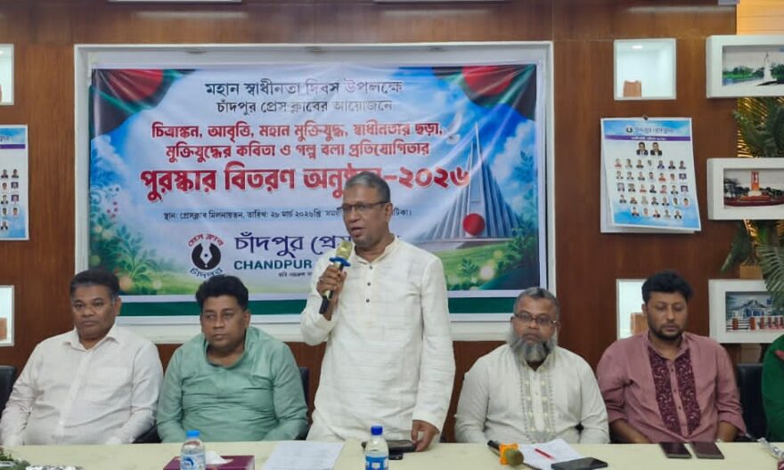 মহান স্বাধীনতার মাস উপলক্ষে চাঁদপুর প্রেস ক্লাবের আয়োজনে মহান মুক্তিযুদ্ধ, স্বাধীনতার ছড়া, মুক্তিযুদ্ধের কবিতা ও গল্পবলা, চিত্রাঙ্কন, আবৃতি প্রতিযোগিতার সমাপনী ও পুরস্কার বিতরণ অনুষ্ঠিত হয়েছে। প্রতিযোগিতায় প্রায় ২শতাধিক প্রতিযোগী অংশগ্রহন করেন।