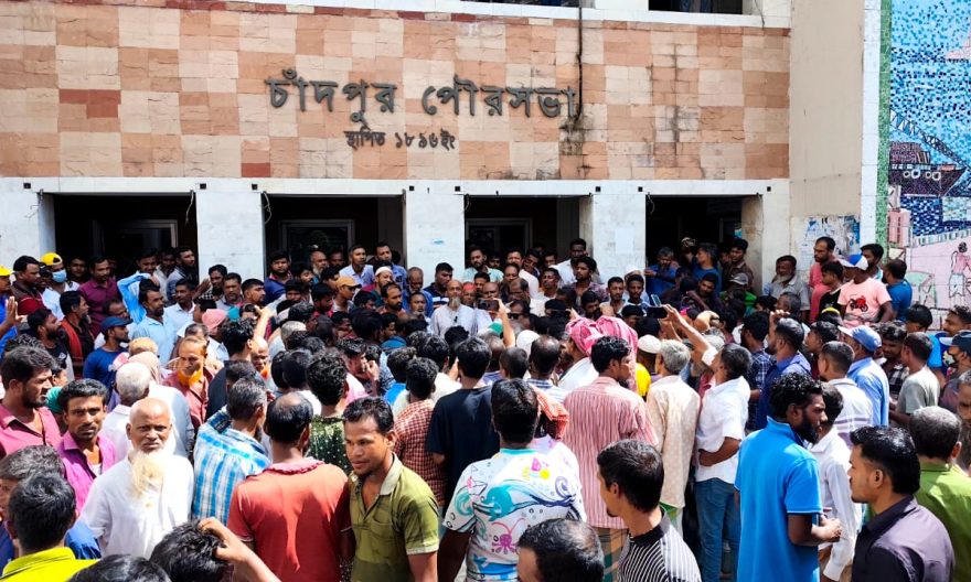 বৃহস্পতিবার দুপুরে চাঁদপুর পৌরসভার সামনে মালিক-শ্রমিকরা বিক্ষোভ করে।