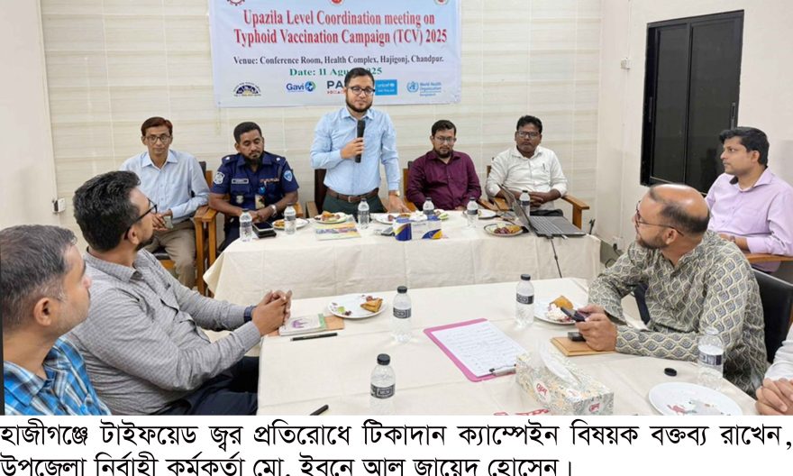 হাজীগঞ্জে টাইফয়েড জ্বর প্রতিরোধে টিকাদান ক্যাম্পেইন বিষয়ক সমন্বয় সভা অনুষ্ঠিত হয়েছে। সোমবার (১১ আগষ্ট) সকালে উপজেলা স্বাস্থ্য কমপ্লেক্সের সভাকক্ষে অনুষ্ঠিত সভায় প্রধান অতিথির বক্তব্য রাখেন, উপজেলা নির্বাহী কর্মকর্তা ও টাইফয়েড টিকাদান ক্যাম্পেইন কমিটির সভাপতি মো. ইবনে আল জায়েদ হোসেন।